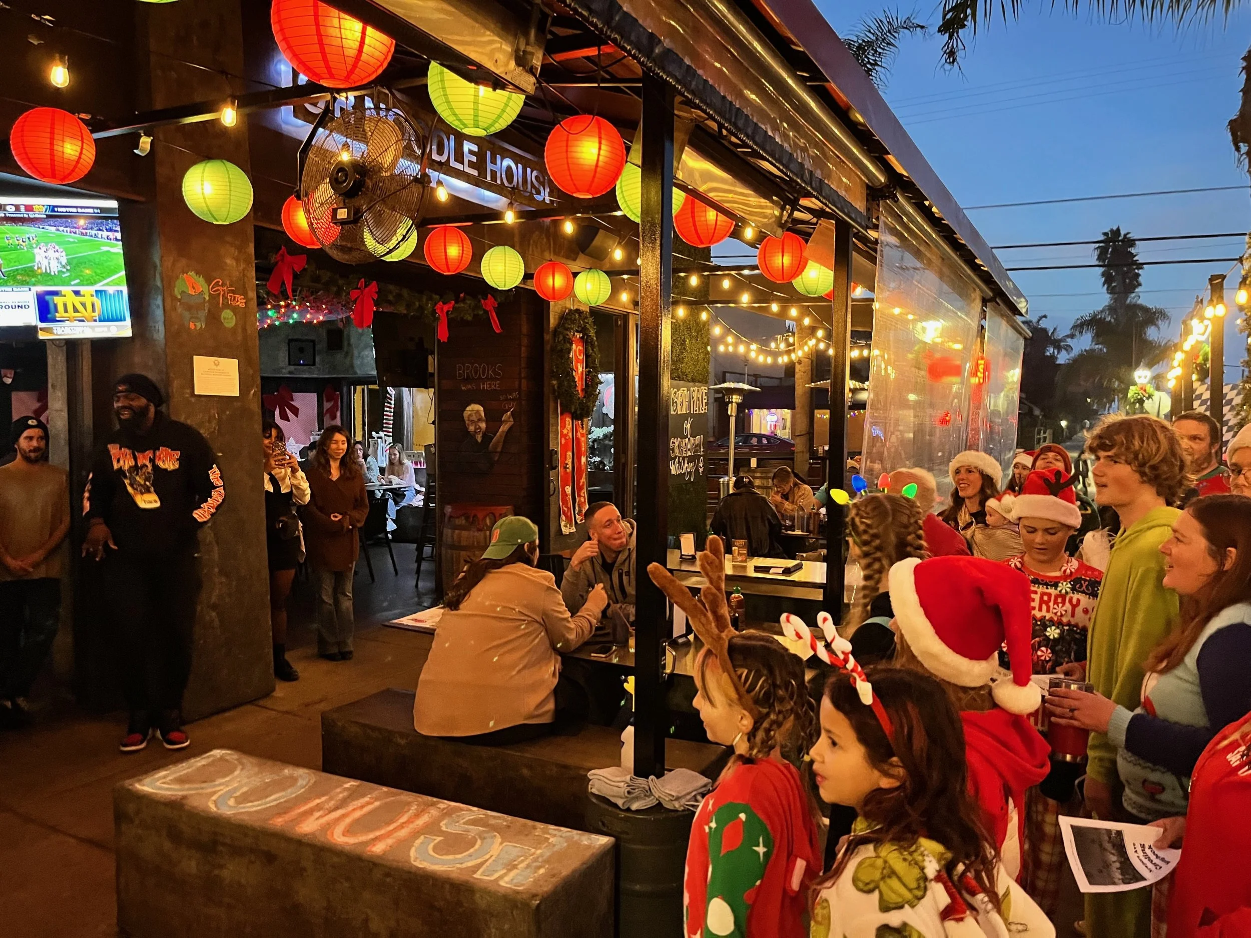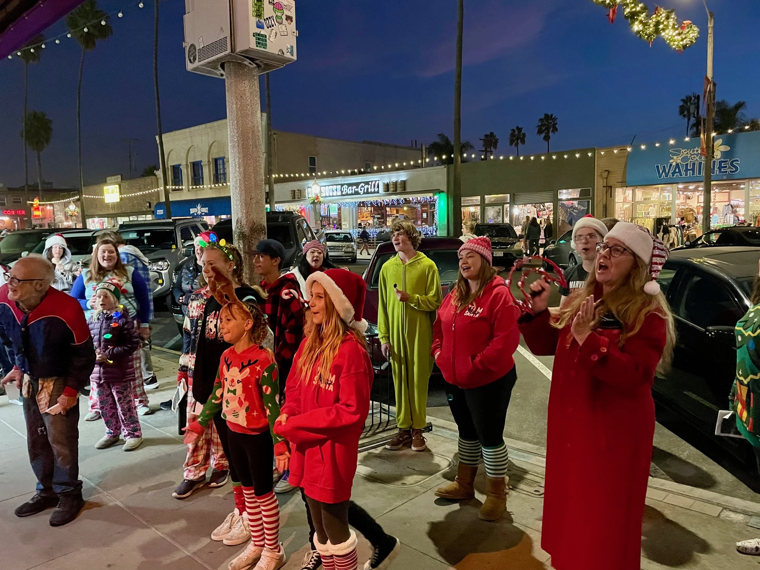 We meet at the tree at sunset, practice a few songs, and then head up Newport, spreading holiday cheer to the neighborhood.