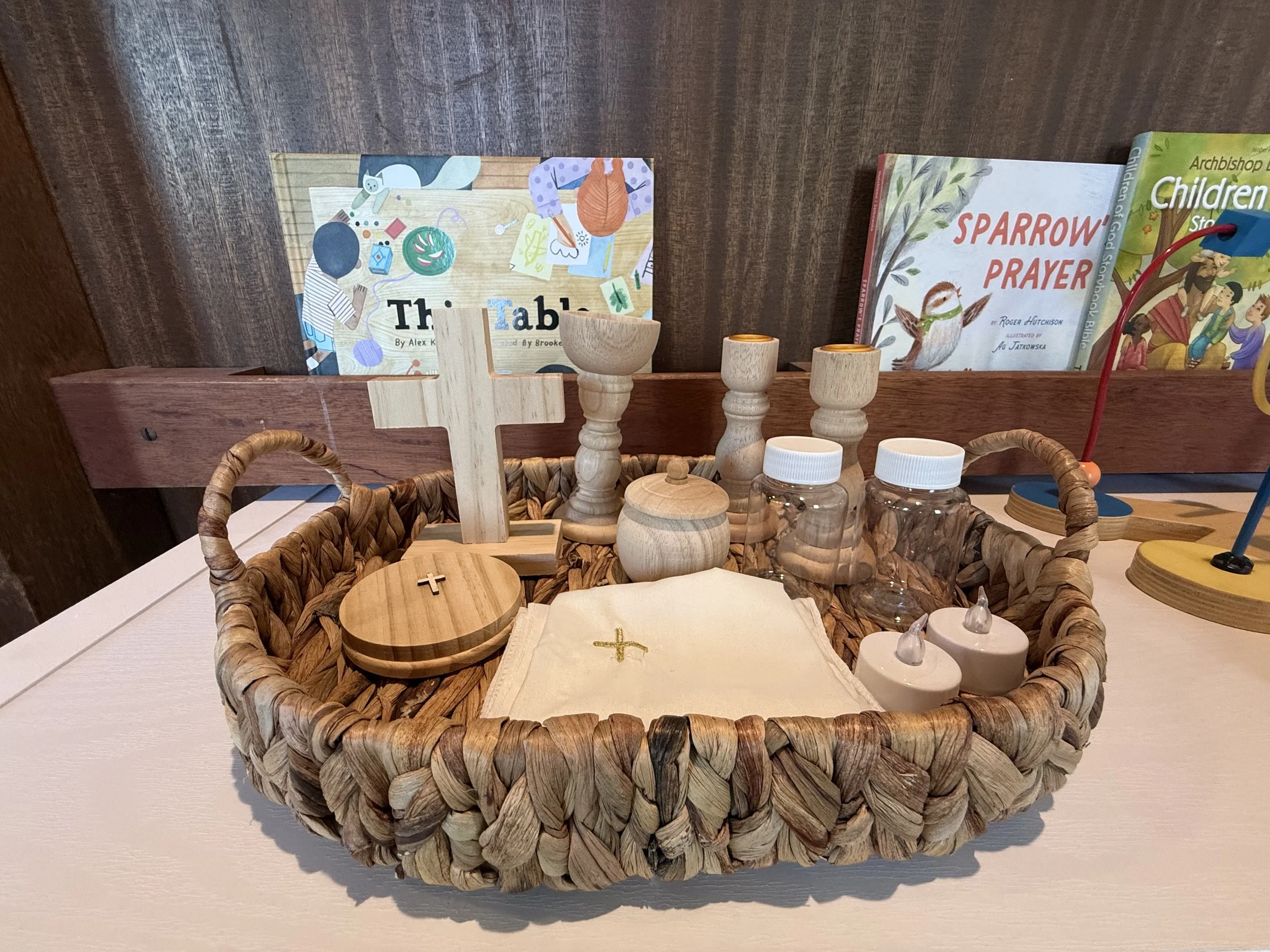During Communion, children even have their own small table setting where they can follow along and participate in communion in the Godly Play space.
